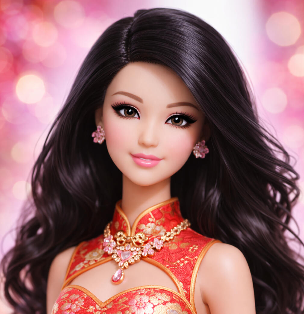 She has a polished doll-like look with long, wavy black hair, smooth fair skin, large brown eyes, soft pink lips, and a gentle smile.