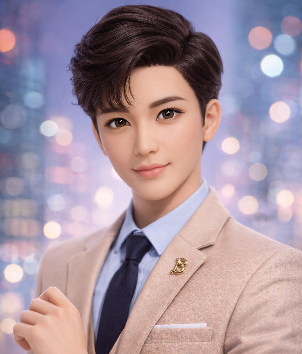 He has a polished doll-like look with neatly styled dark brown hair, smooth fair skin, large brown eyes, soft facial features, and a calm smile.